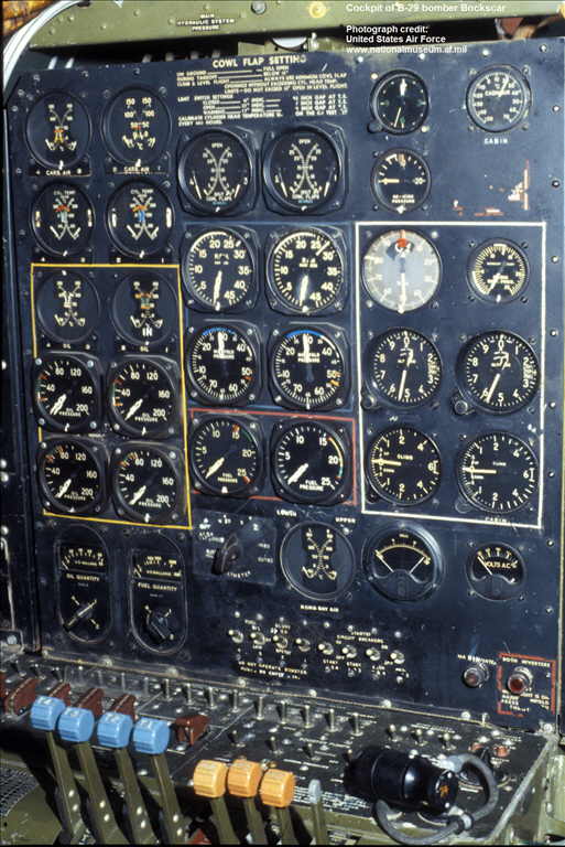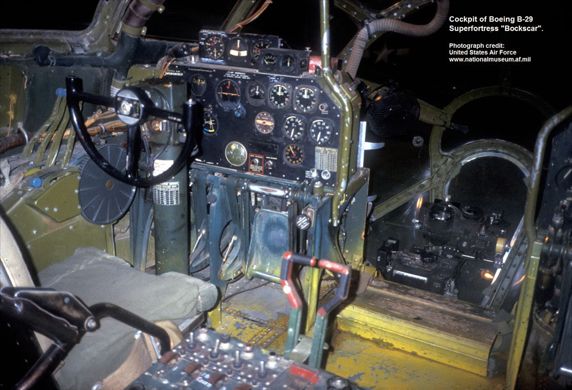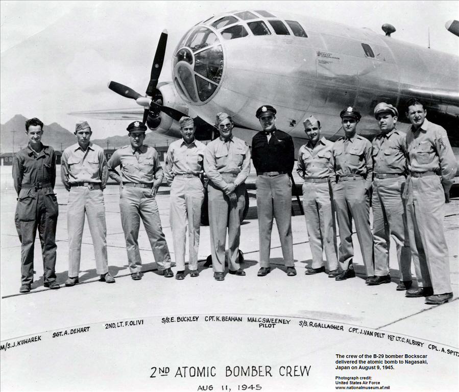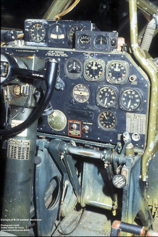 Below are photograhs of Charles W. Sweeney and the crew of Bockscar, two days after the atomic bombing of Nagasaki and various views of the plane's cockpit.
